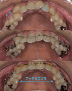 今回の症例では主に歯列のアーチを広げる治療を行っています。