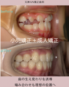 今回の症例は、小児矯正 → 成人矯正を組み合わせたケースです。